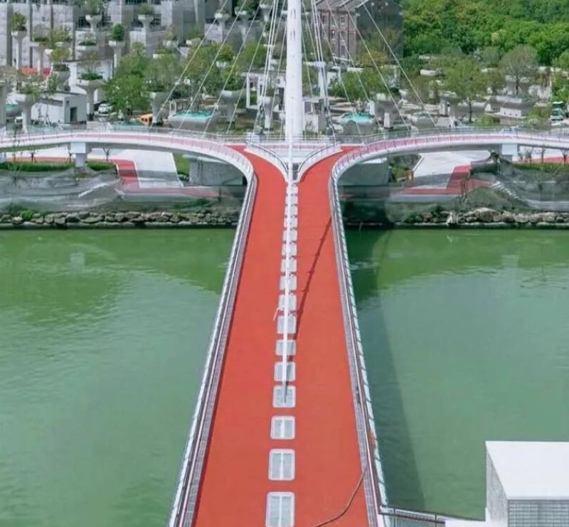 从空中俯瞰,百合桥呈“人”字形布局,桥梁主体和桥下绿化景观构成“合”字,体现“融合”理念。